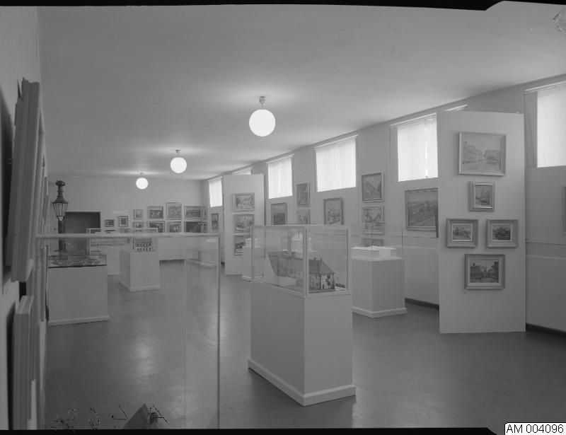 Bild som visar Malmö museum, tillfällig utställning C.O Larsson 1957. Tavlor och glasmontrar.