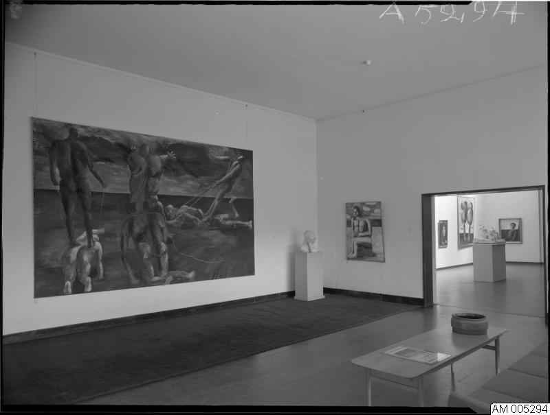 Bild som visar Svend Wiig-Hansen, utställning april-maj 1963. Tavlor, skulpturer, en soffa och ett bord.