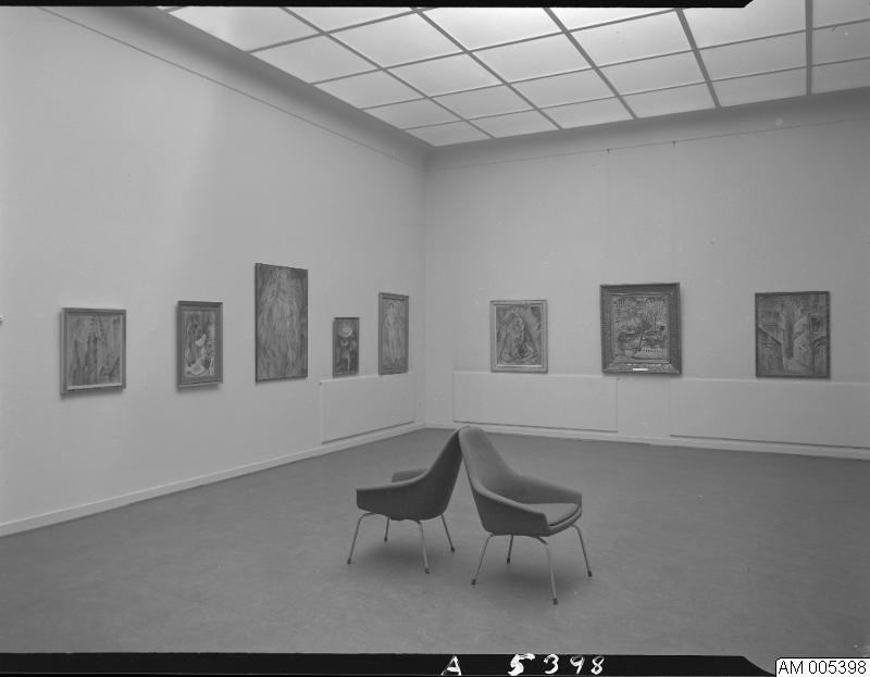 Bild som visar Nils Dardel utställning 16 november-18 december 1963. Tavlor och stolar.
