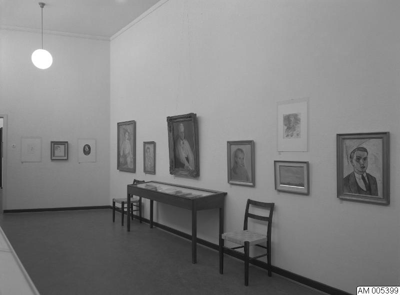 Bild som visar Nils Dardel utställning 16 november-18 december 1963. Tavlor och stolar.