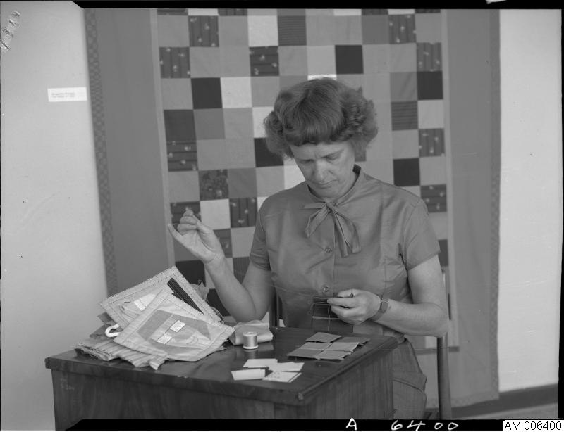 - Bild som visar lapptäcke-utställningen V.M.T. (Västsvenska mönstertecknare). På Malmö museum 27 april - 28 maj 1967. Broderande amanuens, Lotte Ehrenstråle visar hur man syr lapptäcken 25 maj 1967 klockan 13-16.