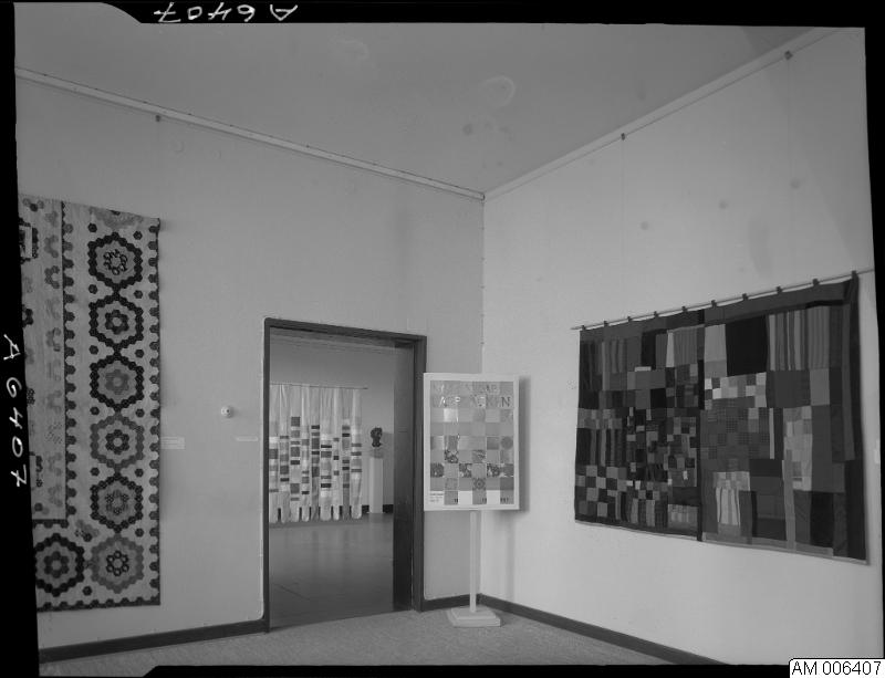 - Bild som visar lapptäcke-utställningen V.M.T. (Västsvenska mönstertecknare), på Malmö museum 27 april - 28 maj 1967. Lapptäcken.
