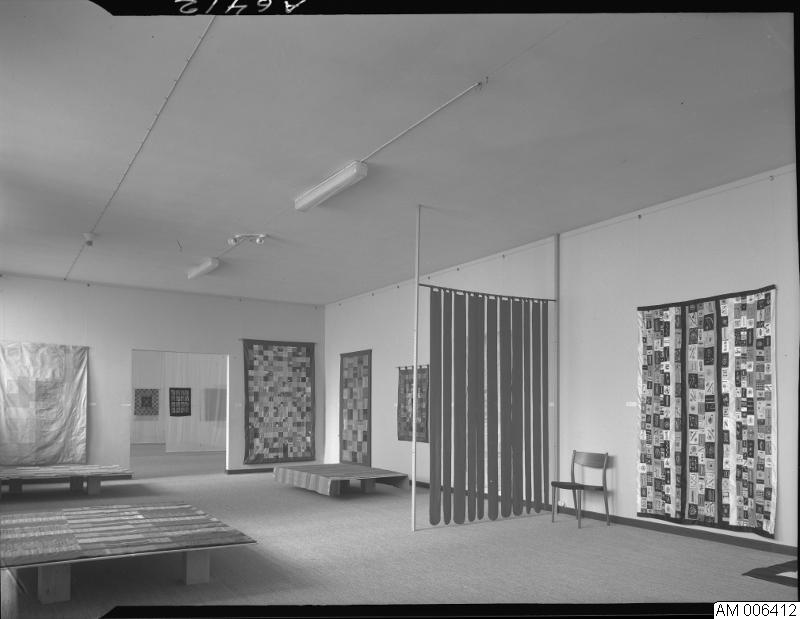 - Bild som visar lapptäcke-utställningen V.M.T. (Västsvenska mönstertecknare), på Malmö museum 27 april - 28 maj 1967. Lapptäcken.