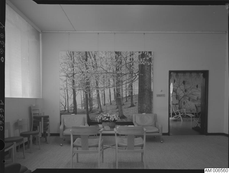 Bild som visar Skånska stolar, tillfällig utställning 15 oktober-12 november 1967. Även bord och en målning. Bilden tagen på Malmö museum.