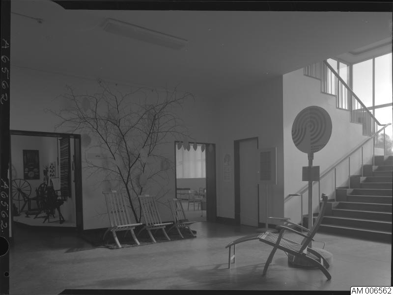 Bild som visar Skånska stolar, tillfällig utställning 15 oktober-12 november 1967. Även ett träd med prydnader. Vid en trappa. Bilden tagen på Malmö museum.