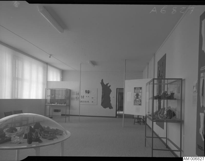 Bild som visar "Mest skor men också strumpor", tillfällig utställning april 1969. Diverse bilder av utställningen. Glasmontrar med skor, skärmar med strumpor på väggarna.