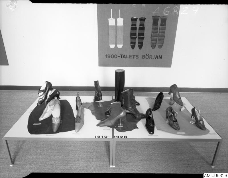 Bild som visar "Mest skor men också strumpor", tillfällig utställning april 1969. Diverse bilder av utställningen. Skor på ett bord, strumpor på skärmar i bakgrunden.