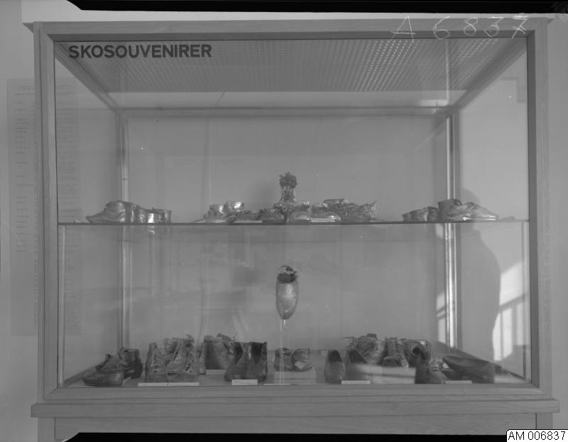Bild som visar "Mest skor men också strumpor", tillfällig utställning april 1969. Diverse bilder av utställningen. Glasmontrar med skor.