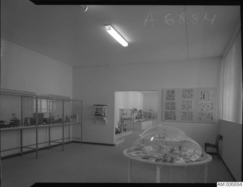 Bild som visar Lekar och spel, tillfällig utställning, 30 november 1967 - 25 februari 1968. TING TILL LEK. Glasmontrar med dockmöbler, dockor och en liten teservis.