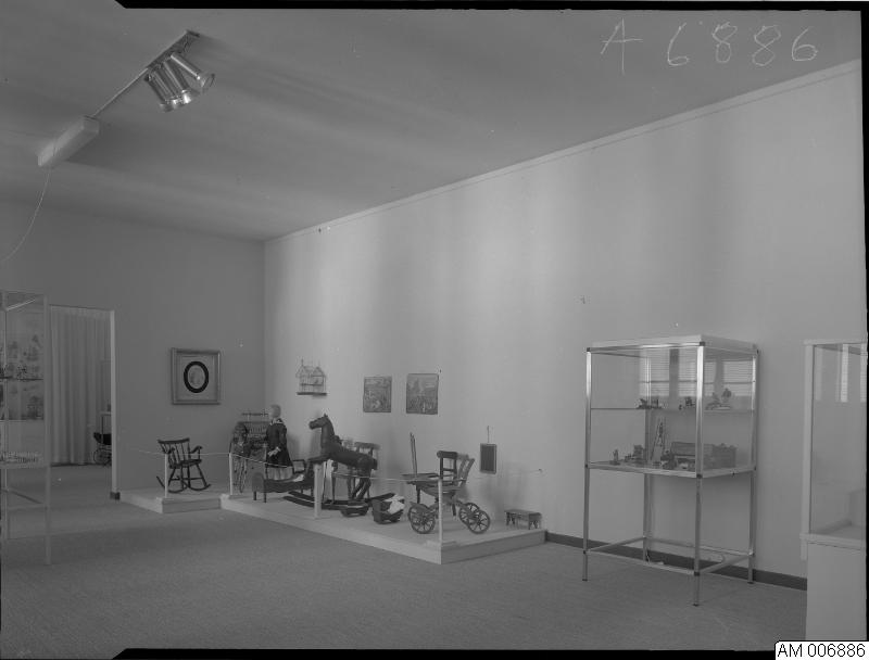 Bild som visar Lekar och spel, tillfällig utställning, 30 november 1967 - 25 februari 1968. TING TILL LEK. Glasmontrar. Gunghäst.