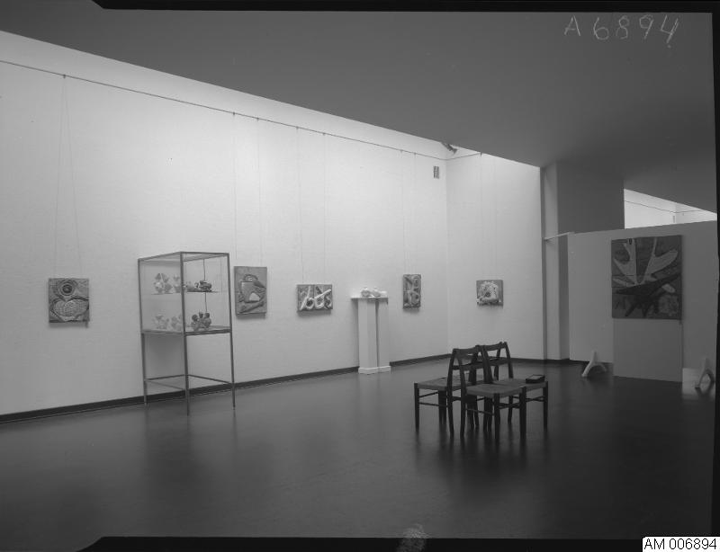 Bild som visar Tyra Lundgren, stengodsskulpturer reliefer, tillfällig utställning Malmö museum 8 mars till 7 april 1969. Glasmonter, tavlor och stolar.