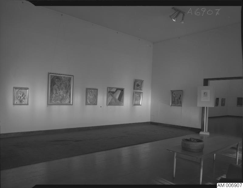 Bild som visar Tora Vega Holmström, minnesutställning 18 november 1967- 7 januari 1968. Tavlor och ett bord.