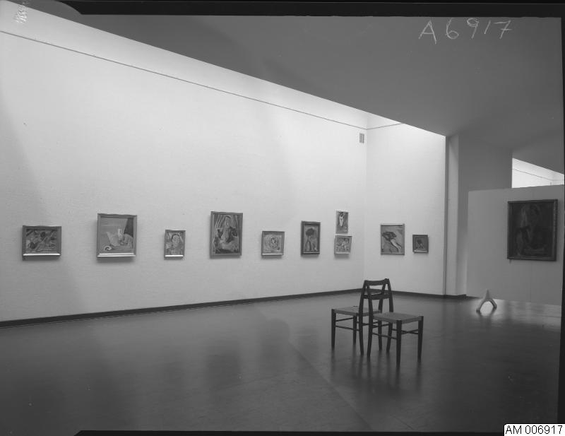 Bild som visar Tora Vega Holmström, minnesutställning 18 november 1967- 7 januari 1968. Tavlor och stolar.
