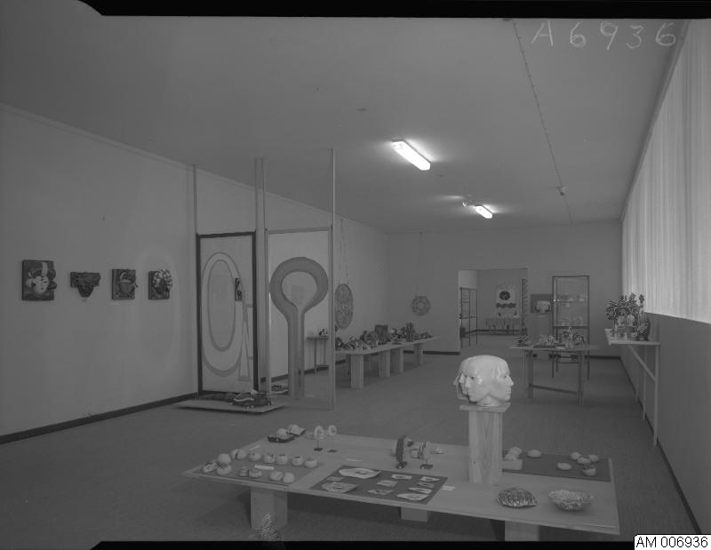 Bild som visar glas och keramik i fria former, tillfällig utställning Malmö museum, 19 november till 25 december 1968. I samarbete med Röhsska museet, Göteborg.