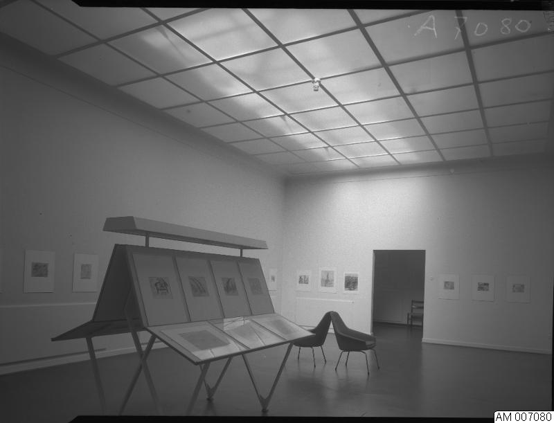 - Bild som visar C.F. Hills teckningar, tillfällig utställning Malmö museum den 20 juni- 25 augusti 1968. Stolar och inramade teckningar.