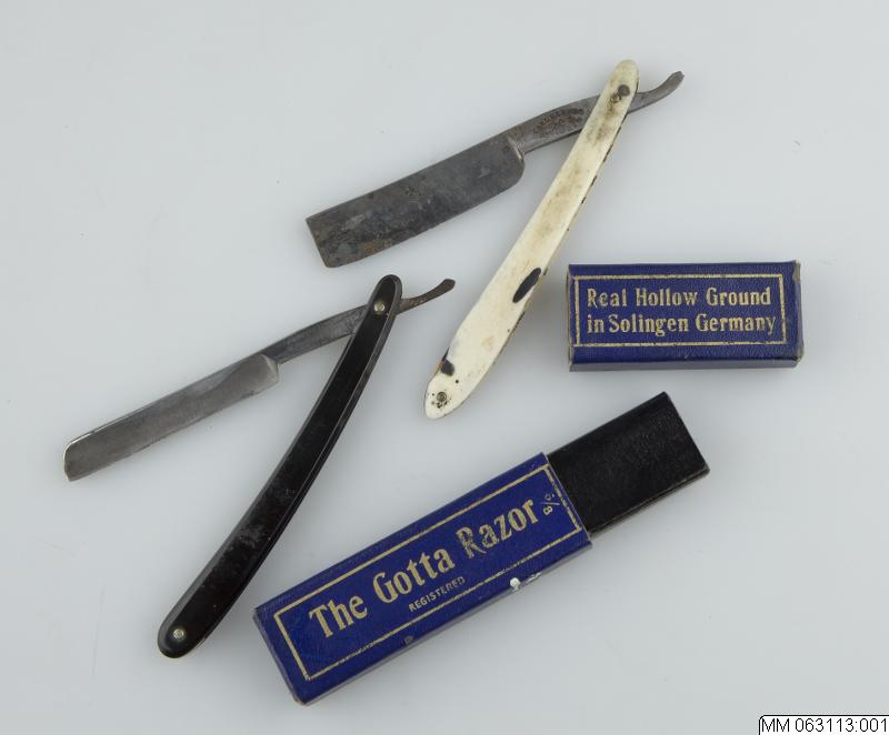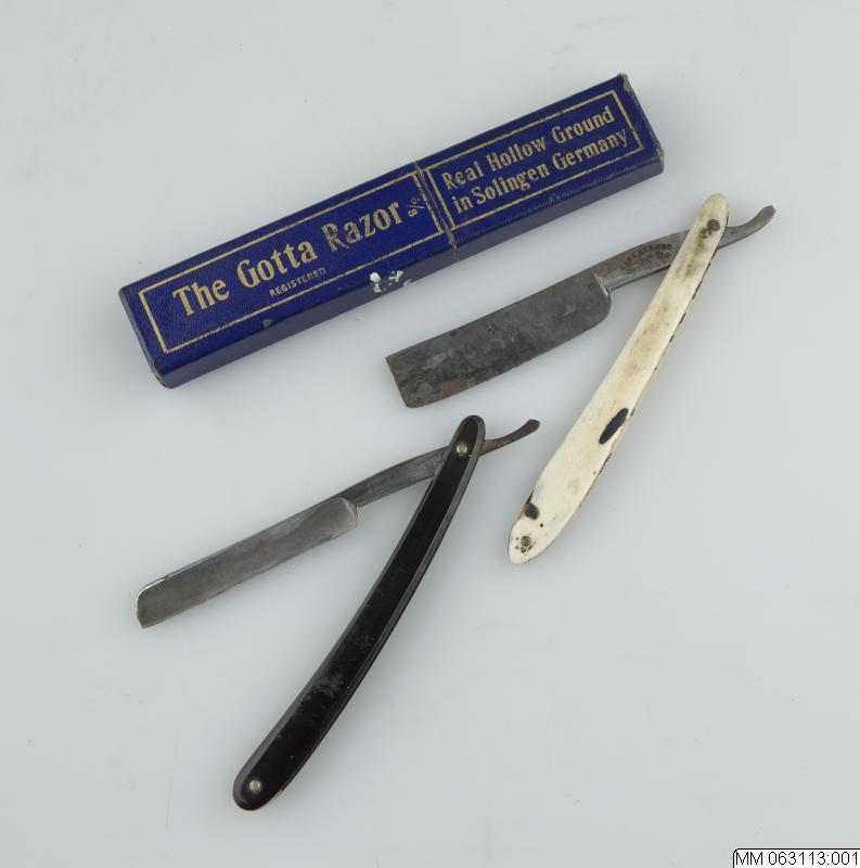 Blått fodral i papp avsett för rakkniv. Text på fodralet:"The Gotta Razor, Real Hollow ground in Solingen Germany" I fodralet låg en svensktillverkad rakkniv inventarienummer MM 063113:001.