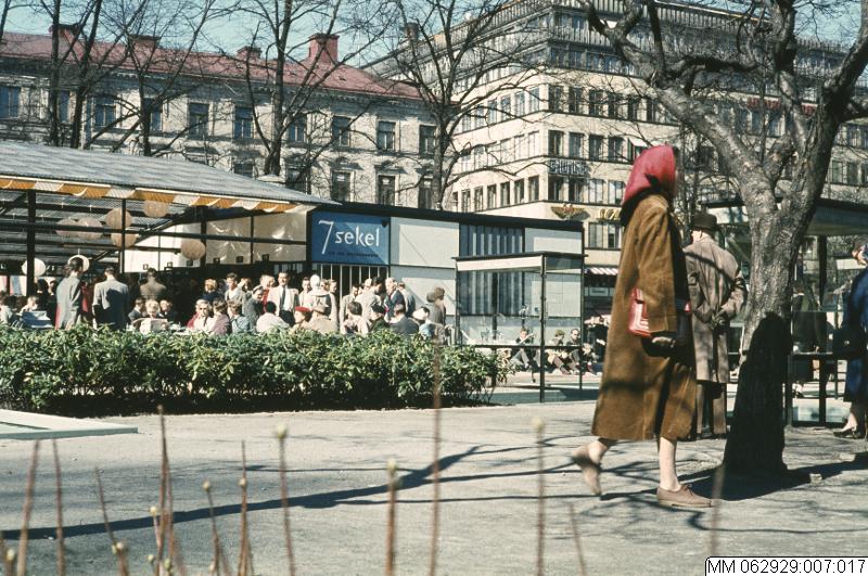 - De så kallade Sagerska husen vid Hamngatan i Stockholm syns delvis bakom restaurangen 7 sekel i Kungsträdgården. Möjligen i slutet av 1950-talet.