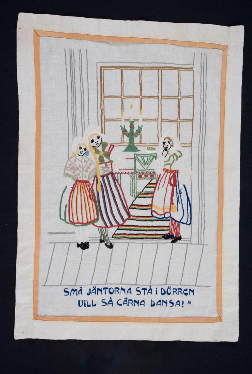 - Julbonad (?) sydd på vitt linne med stjälksöm. Tre flickor i folkdräkt står i en dörröppning, bakom dem syns en trasmatta, stol, bord med en trearmad ljusstake på samt ett fönster. Under flickorna står texten: SMÅ JÄNTORNA STÅ I DÖRREN VILL SÅ GÄRNA DANSA! Längs ytterkanterna är bottentyget invikt mot rätan och nersytt med maskin tillsammans med en orange bomullskant.