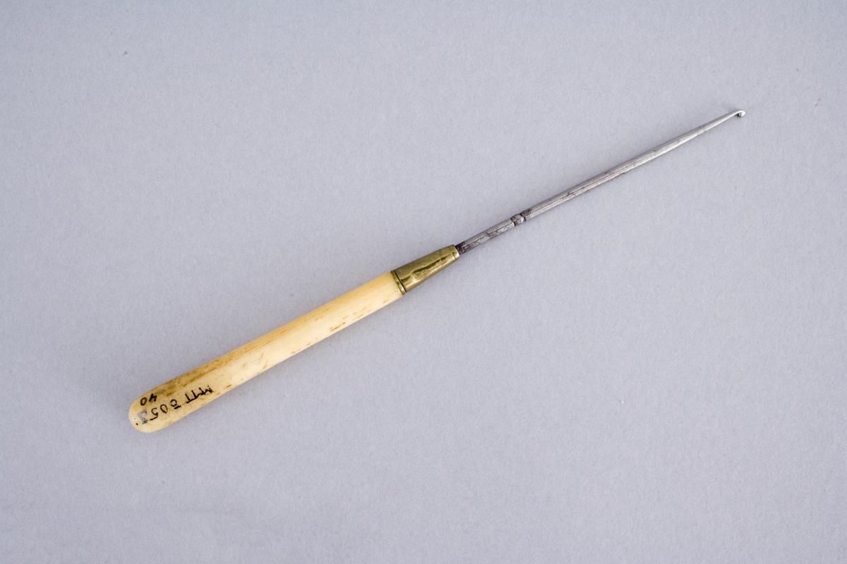 Virknål där själva nålen är av metall och skaftet är av ben. Nålfästet är av mässing.