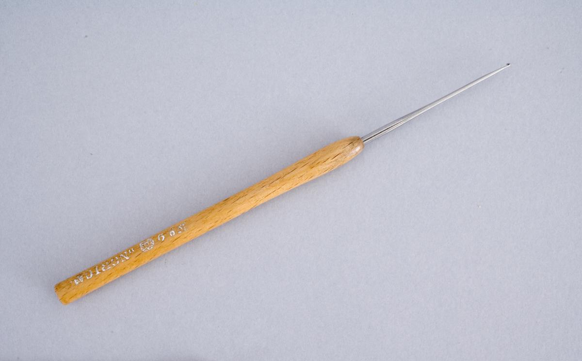 Virknål där själva nålen är av metall och skaftet är av trä. Märkt: No 9 Norica.