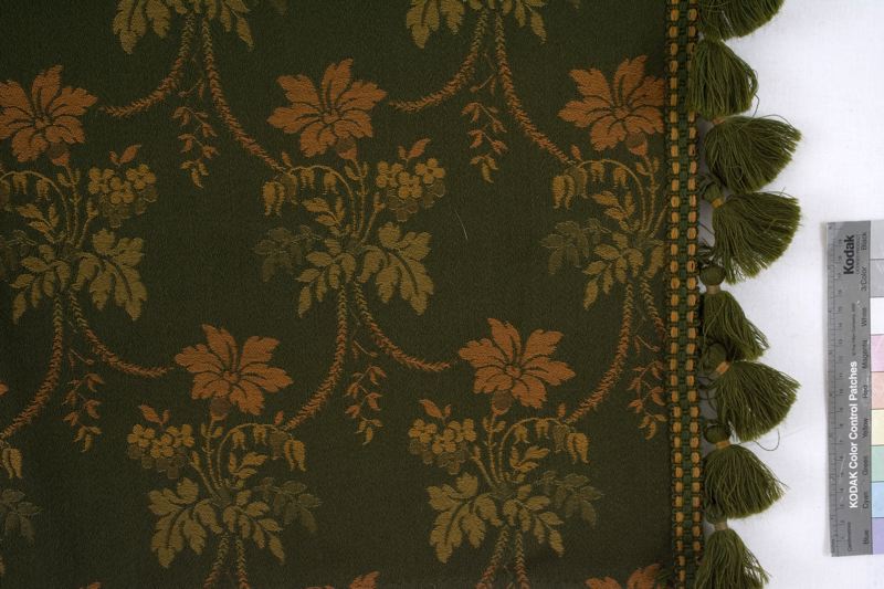 Ett par delar till en gardinuppsättning av mörkgrönt, mönstervävt ylle. Mönstret är blommor i orange - beigegula färger, jämnt spridda över tygets yta. Ena långsidan är kraftigt avrundad och kantad med en grön tofsbandfrans av ylle.