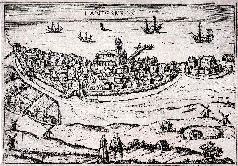 Stadsvy över Landskrona från Braun & Hogenbergs "Civitas orbis terrarum".