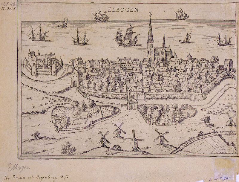 Vy över Malmö ur Braun och Hogenbergs bildverks 4:e del, 1594. I bildytans mitt staden med en kyrka (S:t Petri) omgiven av vallgravar, t.v ett slott (Malmöhus). I förgrunden ängar och inhägnade planteringar samt fem väderkvarnar. I bakgrunden vatten (Öresund) med flera segelfartyg. I övre kanten textat ELBOGEN.