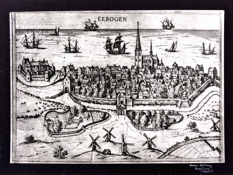 - Vy av Malmö ur Braun och Hogenbergs bildverk över "världens märkligaste orter", band 4, 1594. I mitten staden med en kyrka (S:t Petri) omgiven av vallgravar, t.v ett slott (Malmöhus). I förgrunden ängar och inhägnade planteringar samt fem väderkvarnar. I bakgrunden vatten (Öresund) med flera segelfartyg.