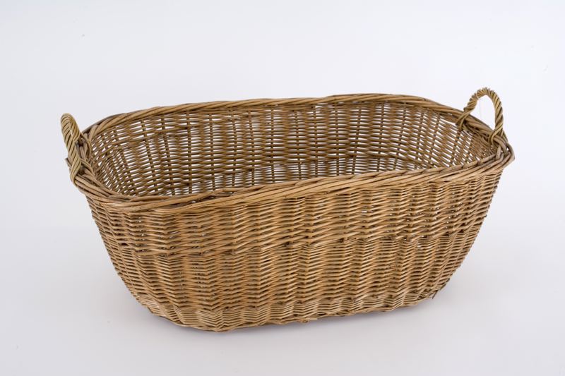Mangelkorg av flätad rotting. Ett handtag på var kortsida. Trribbor i botten för stadga.