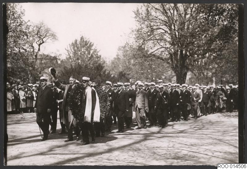 - Lunds Studentsångsförening 100 år. Lunds studentsångare med dess dirigent tullkontrollör Emil Gagner marscherar upp till Otto Lindblads statyn på Lundagård. Okänt årtal.