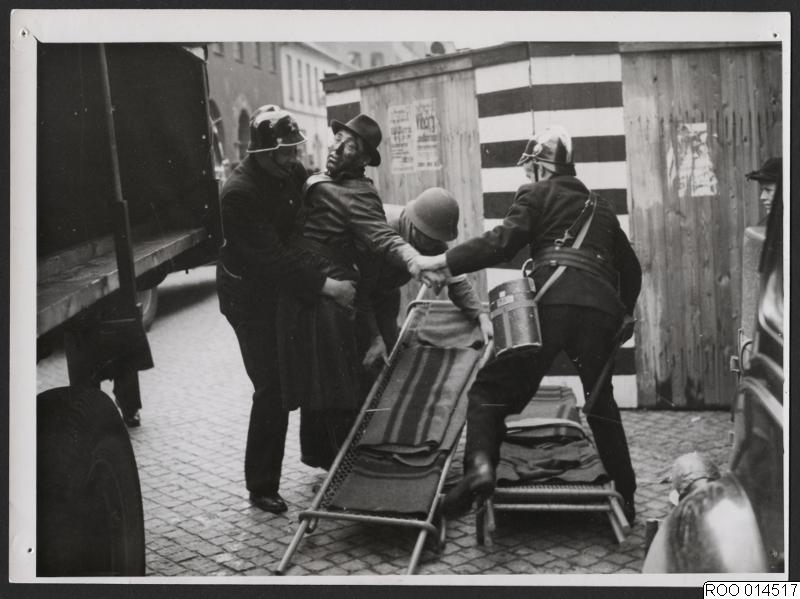 ROO 014517 :: 1940-talet, malmö, bår, ambulanspersonal, 1941, luftskyddsövning, sjukvårdare