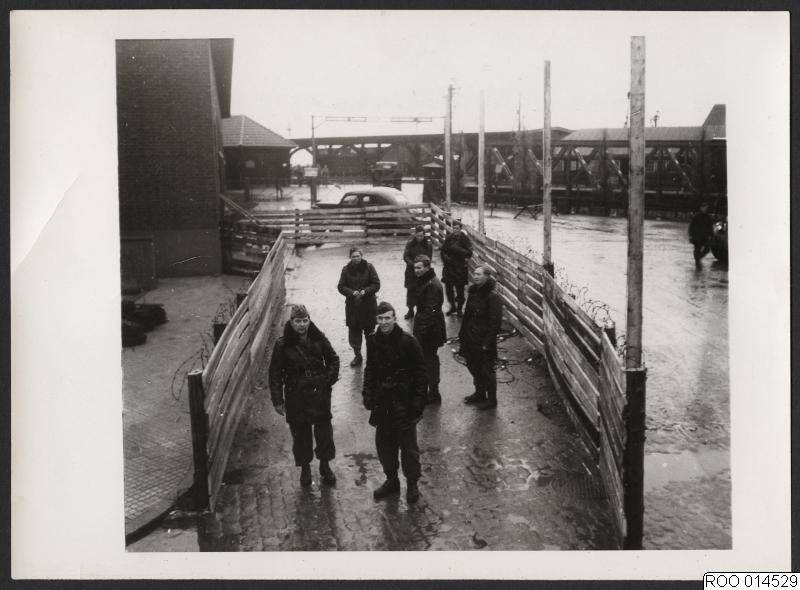 ROO 014529 :: kaj, fånge, träfållar, träfålla, 1940-tal, fångar, militärer, taggtråd, 1945: trelleborg, militär