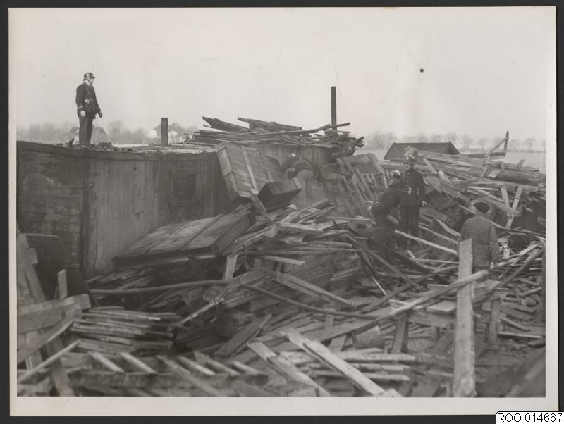 - Utomhusbild som visar följden av en eldsvåda. I en arbetarhydda på en byggnadsplats vid Roslins väg i Malmö, intill Regementsgatan, utbröt en häftig eldsvåda på morgonen. Trähyddan brann på kort tid ner, men tack vare brandkårens snabba ingripande, begränsades elden till denna. Eldhärden var omgiven av ett flertal liknande hyddor samt stora staplar av brädor. Bilden visar uppröjningsarbetet.