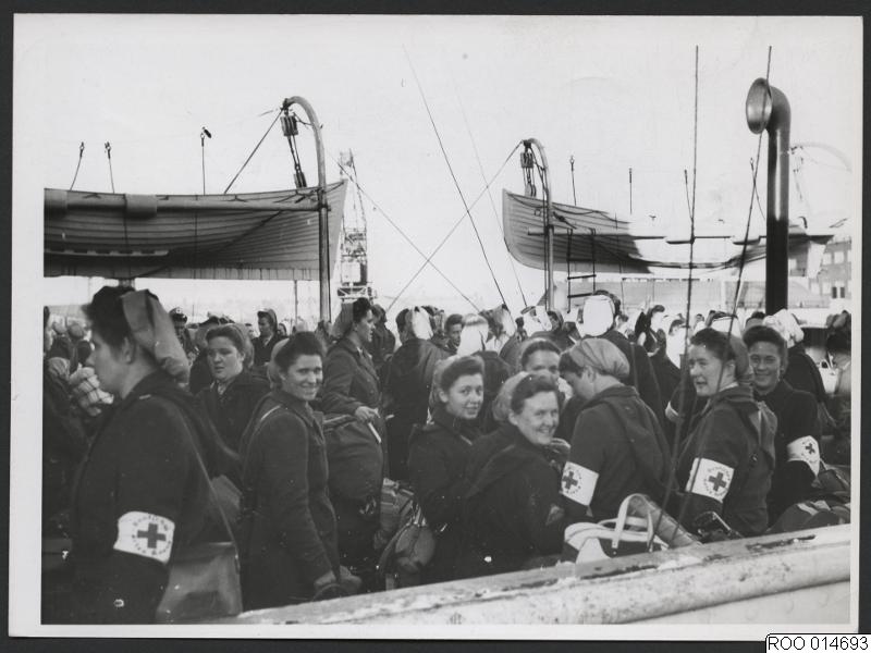 - Utomhusbild som visar tysk sanitetspersonal från Finland. På genomresa från Finland passerade på torsdagsmorgonen 383 tyska Röda Korset-sjuksköterskor Malmö för vidare resa med färjan till Köpenhamn. Bilden visar sköterskorna ombord på färjan.