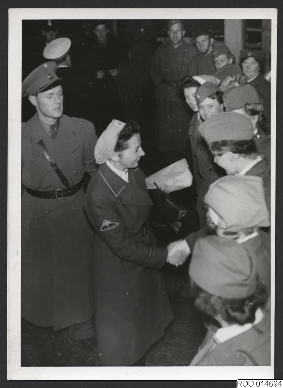 - Utomhusbild som visar tysk sanitetspersonal från Finland. På genomresa från Finland passerade på torsdagsmorgonen 383 tyska Röda Korset-sjuksköterskor Malmö för vidare resa med färjan till Köpenhamn. Bilden visar färdledarinnan Irene Spieler tacka och ta farväl av de svenska lottorna som ansvarat för kosten under resan. Till vänster svenska kontrollofficeren löjtanat Rääf.