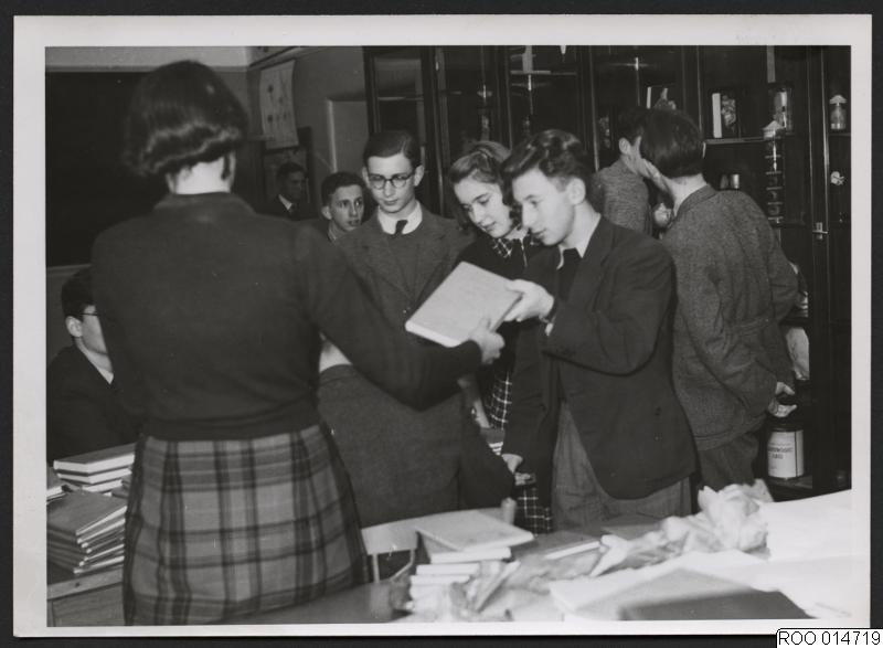 - Inomhusbild som visar en dansk skola i Lund. Vid folkskoleseminariet i Lund har en dansk skola öppnats för att bereda danska flyktingbarn undervisning. Bilden visar bokutlämning av skolans föreståndare.