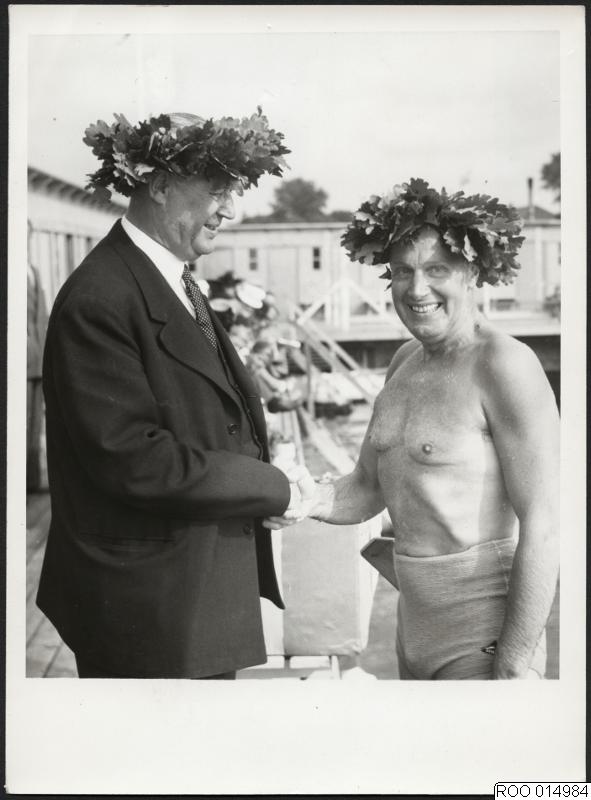 - Guldplakett till spänstig oldboy. Grosshandlaren Arvid Holmberg erhåller av stadsfullmäktiges ordf. dir. Emil Olsson magisterplaketten i guld, simportens högsta utmärkelse. En utmärkt prestation av en 60-åring. Bilden är tagen vid promotionen i Limhamn.
