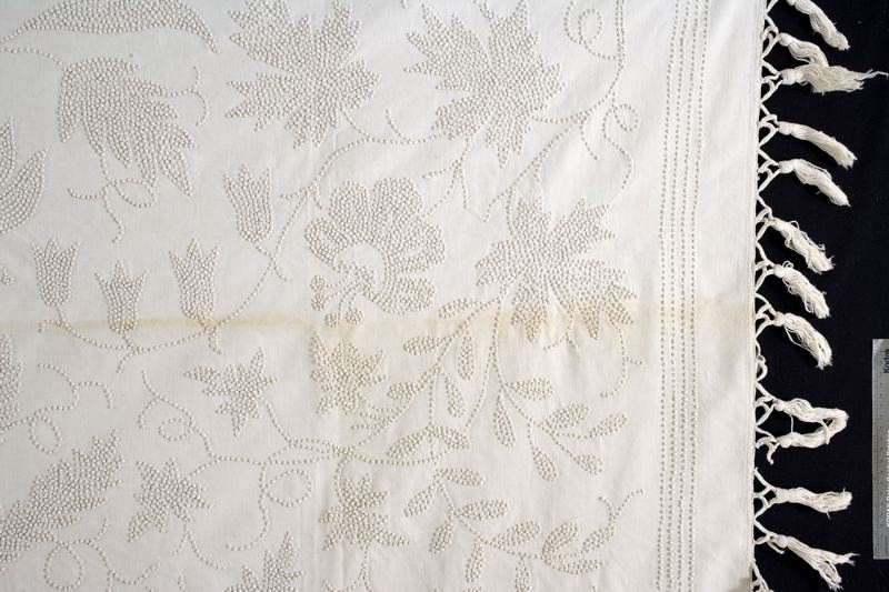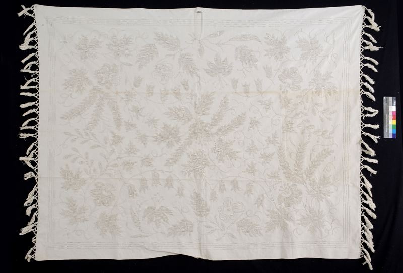 Sängöverkast av vitt bomullstyg med knutsömsbroderier av vitt bomullsgarn. Kantränder, i spegeln blom- och bladmönster. Längs kortsidorna fransar. Fållad på maskin.