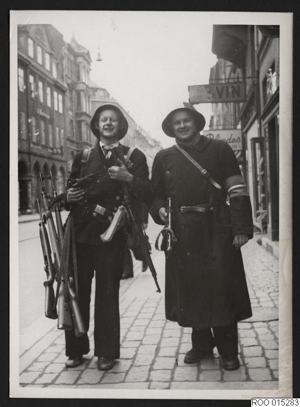 Köpenhamn den 5 maj. Danska frihetkämpar med vapen, tagna från hipomän.