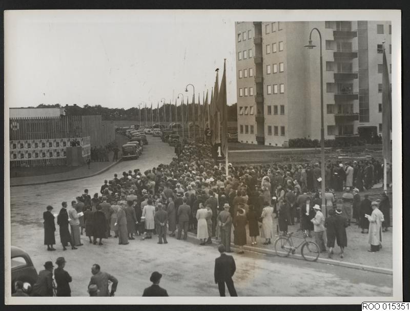 ROO 015351 :: besökare, exteriör, utställning, utställningar, 1936, bo, 1930-talet, vi, bostadshus, kö