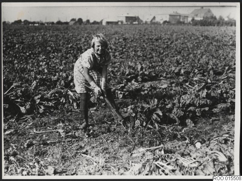 Utomhusbild från 1933 som visar en kvinna som hackar betor (betupptagning, jordbruk) på ett fält.