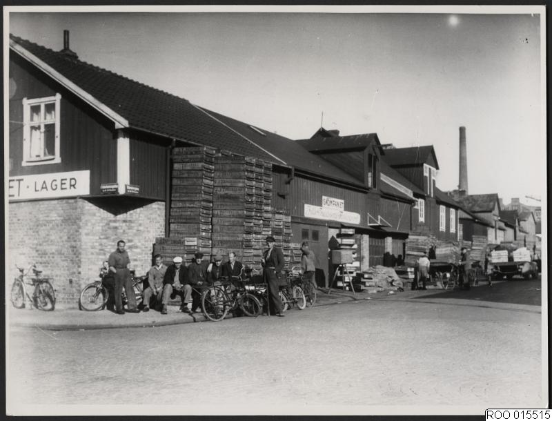 - Utomhusbild som visar några män som tar rast, vid en lagerbyggnad i hamnen.