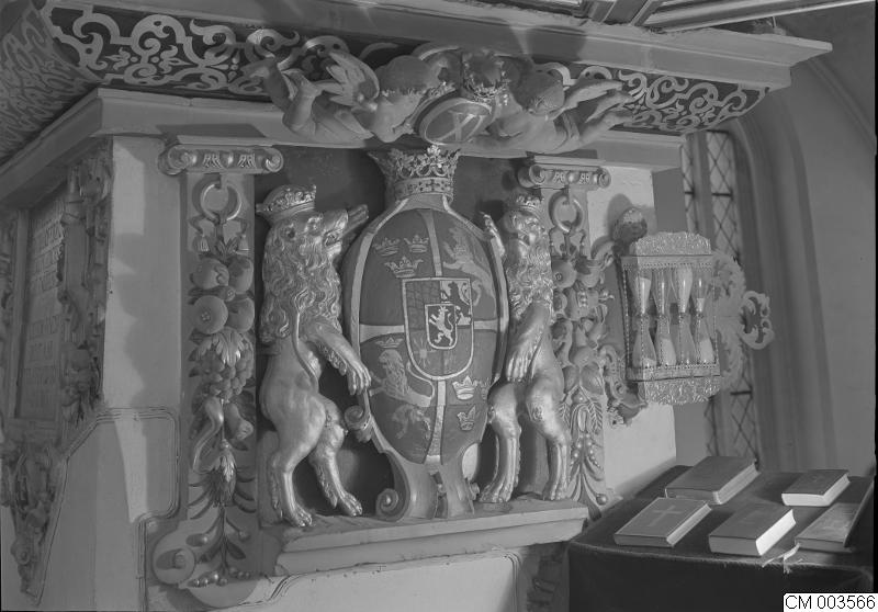 predikstol, statyer, predikstolar, kyrkbyggnader, kronor, sankt petri kyrka, figur, sköld, 1940-talet, 1943, staty, interiör, lejon, kyrkbyggnad, kyrka, krona, kyrkor, interiörer, sköldar, kyrkinteriör, kyrkinteriörer, figurer