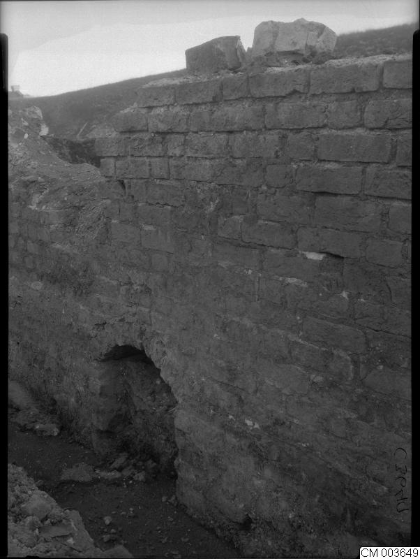 stenbro, byggnader, malmöhus, malmö museer, slottsholmen, mur, broar, 1934, 1934-1937, murar, bro, utgrävningsarbete, grävningar, norra muren, grävning, utgrävningsarbeten, utgrävningar, stenbroar, 1930-talet, hus, malmöhus slott, byggnad, slott, utgrävning