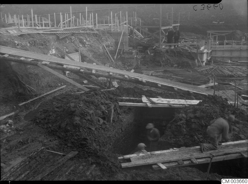 byggnader, malmöhus, malmö museer, slottsholmen, schaktvägg, 1934, 1934-1937, man, män, utgrävningsarbete, grävningar, schaktväggar, grävning, utgrävningsarbeten, utgrävningar, 1930-talet, hus, malmöhus slott, byggnad, slott, utgrävning, lagerprofil, lagerprofiler