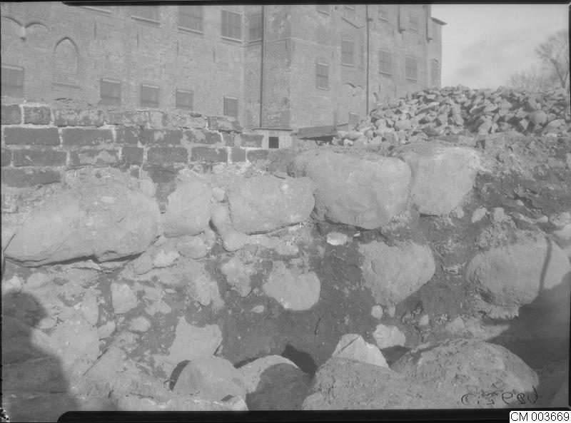 byggnader, malmöhus, malmö museer, slottsholmen, mur, broar, 1934, 1934-1937, murar, bro, utgrävningsarbete, grävningar, grävning, utgrävningsarbeten, utgrävningar, 1930-talet, hus, malmöhus slott, byggnad, slott, utgrävning