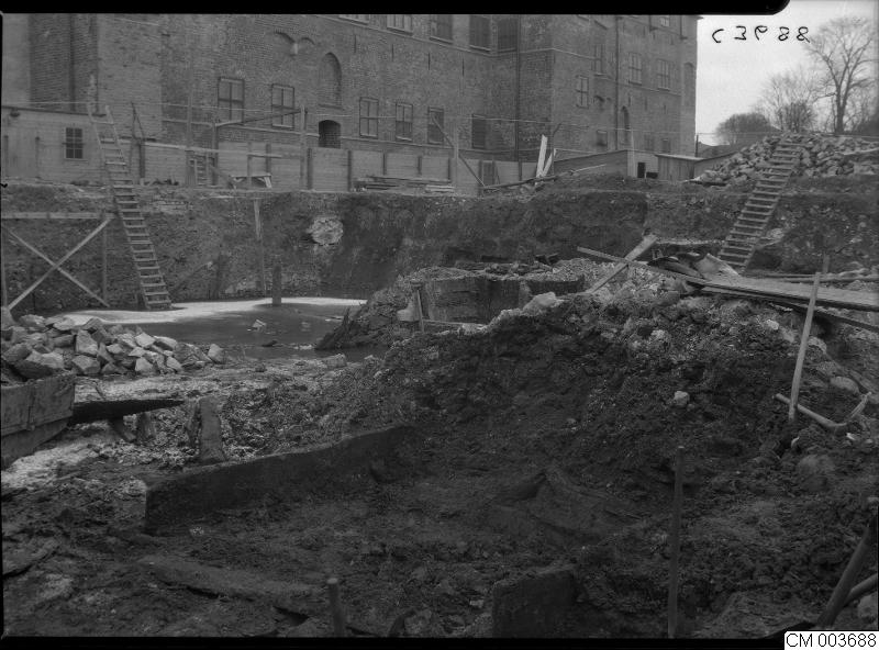 byggnader, malmöhus, malmö museer, plankor, slottsholmen, 1934, fördämning, 1934-1937, dammbord, utgrävningsarbete, grävningar, grävning, utgrävningsarbeten, stegar, planka, utgrävningar, fördämningar, 1930-talet, hus, malmöhus slott, byggnad, slott, utgrävning, stege