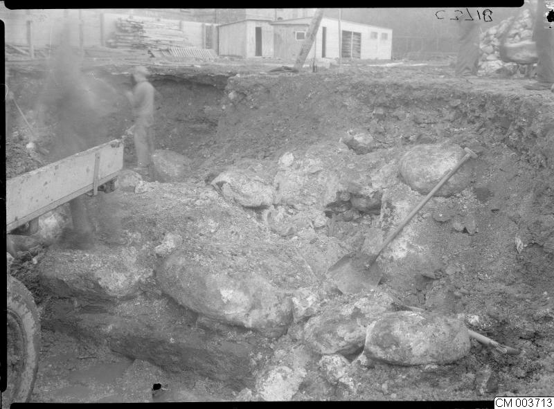 byggnader, malmöhus, malmö museer, slottsholmen, mur, flakbilar, 1934, 1934-1937, murar, utgrävningsarbete, grävningar, grävning, utgrävningsarbeten, lastbil, spadar, utgrävningar, spade, 1930-talet, grundmurar, hus, malmöhus slott, byggnad, slott, lastbilar, flakbil, utgrävning, grundmur