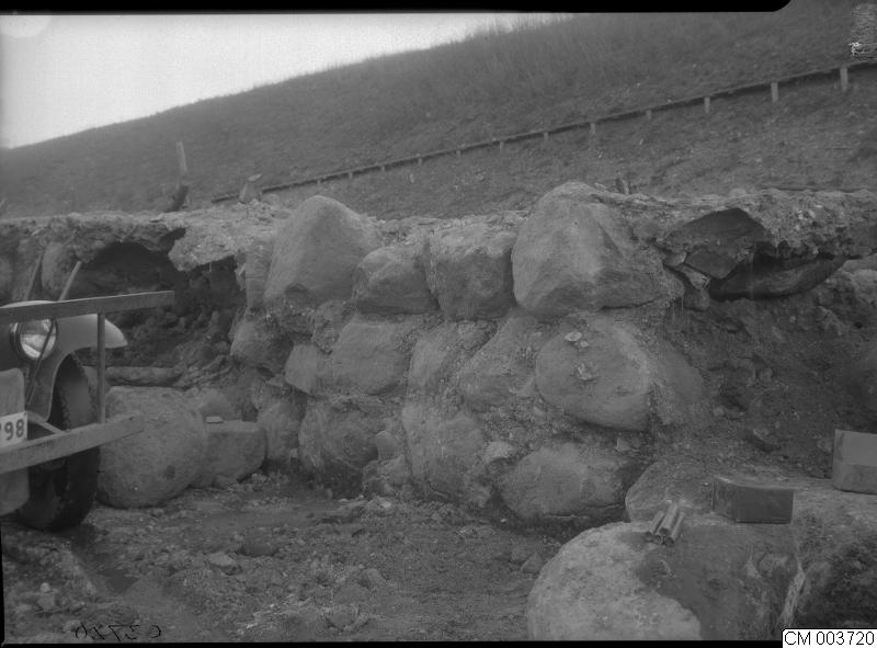 byggnader, malmöhus, malmö museer, slottsholmen, mur, 1934, 1934-1937, långmurar, grunder, murar, utgrävningsarbete, grävningar, långmur, grävning, utgrävningsarbeten, grund, utgrävningar, 1930-talet, hus, malmöhus slott, byggnad, slott, utgrävning