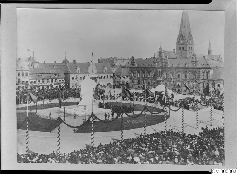 - Foto av Stortorget i Malmö vid avtäckningen av kung Karl X Gustavssstatyn den 28 juni 1896. Folksamling vid händelsen.